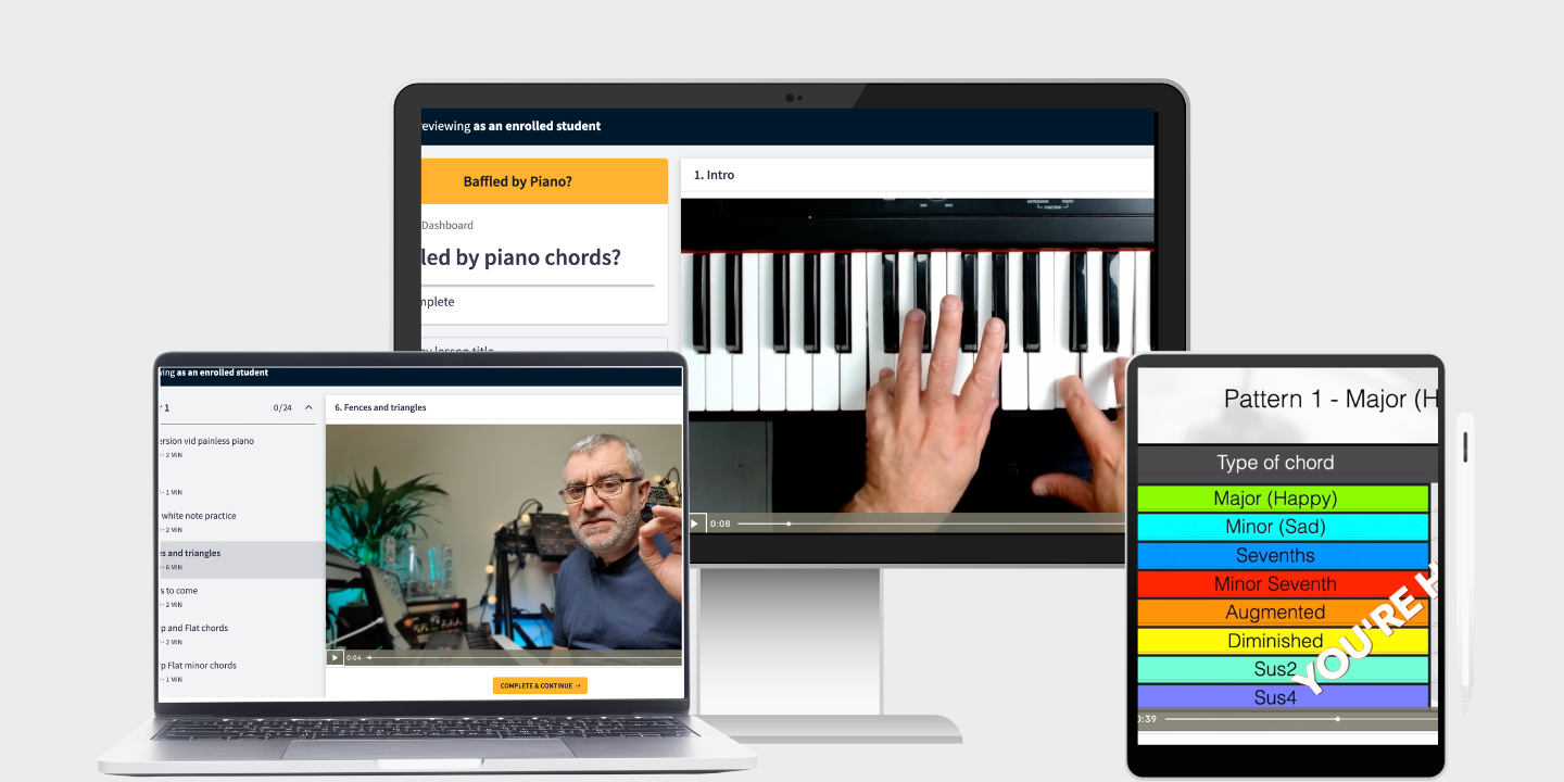 In the next 20 minutes you'll know your first 7 piano chords and be playing a real song. Watch the videos below. No theory, no sheet music, just this